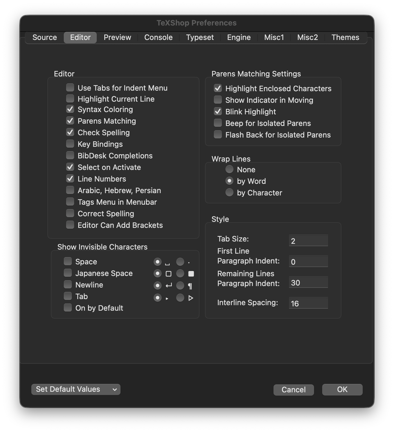 Editor behavior: Auto-save on focus change, format on save using latexindent (need to install this), word wrap with indented continuation lines, and tab size of 2. Sticky scroll and selection highlighting are disabled.