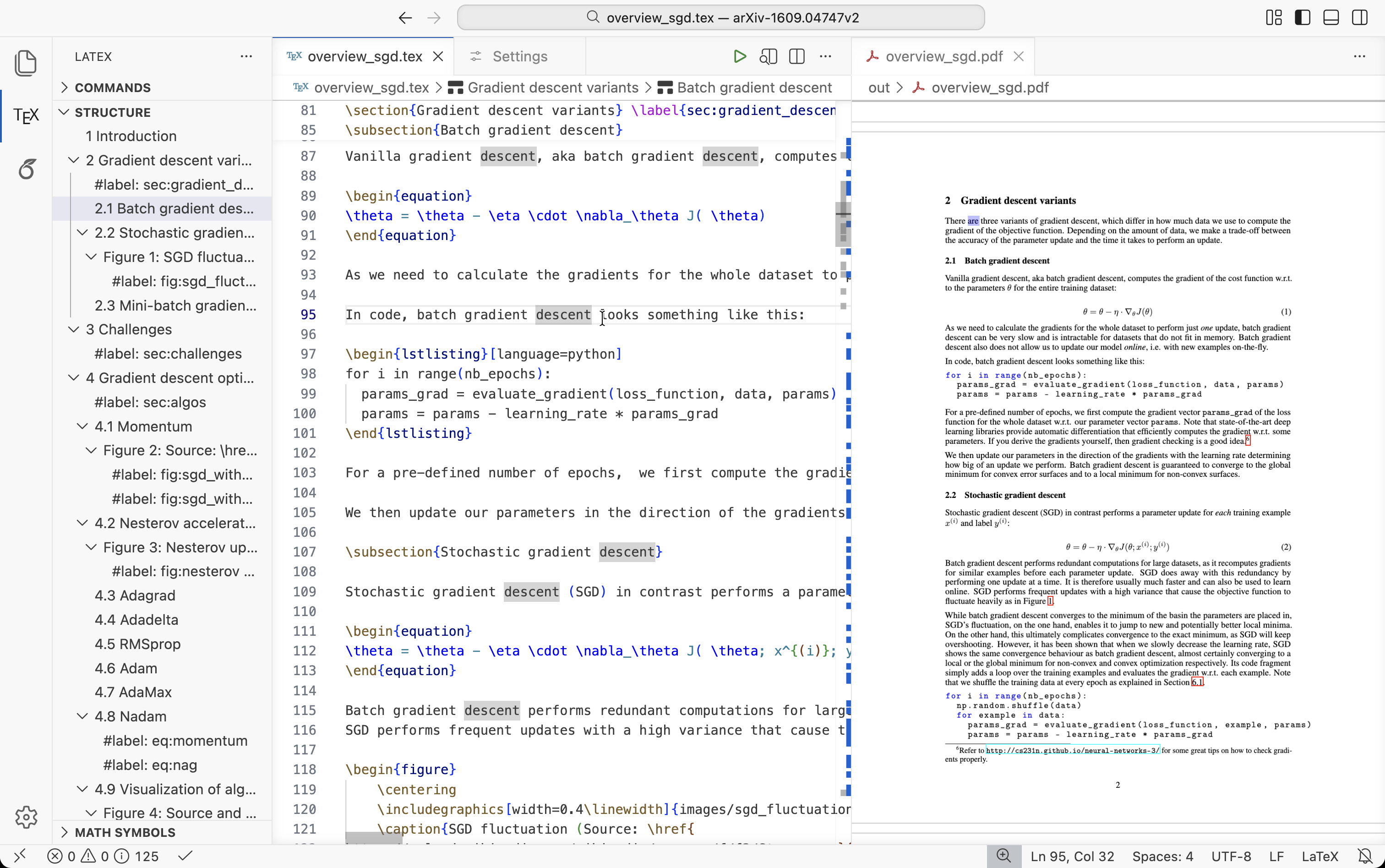 Keyboard shortcuts: To get the experience of native LaTeX editors, some of the basic keyboard shortcuts (bold, italics, underline, typewriter) have been modified. You can copy the contents of the keybindings.json file (Mac / Windows) and paste them into VSCodium by clicking View > Command Palette > typing “Preferences: Open Keyboard Shortcuts (JSON)” > and pressing Enter. You can similarly add and modify your favorite shortcuts.
