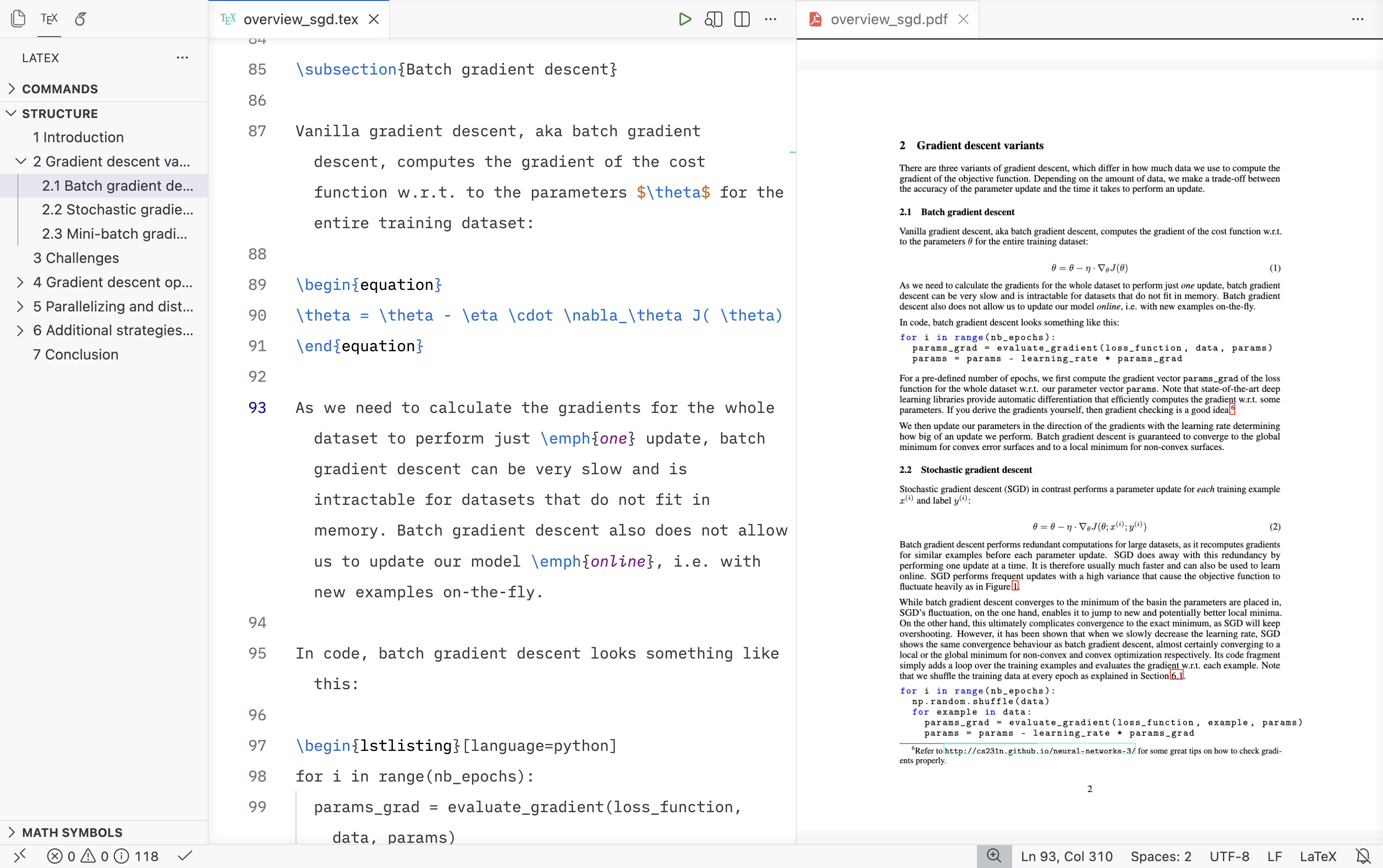 Zen mode: If you just want the main editor and PDF viewer without any toolbars, Zen Mode is useful. You can activate it by clicking View > Appearance > Zen Mode or by using the keyboard shortcut (cmd+k z).